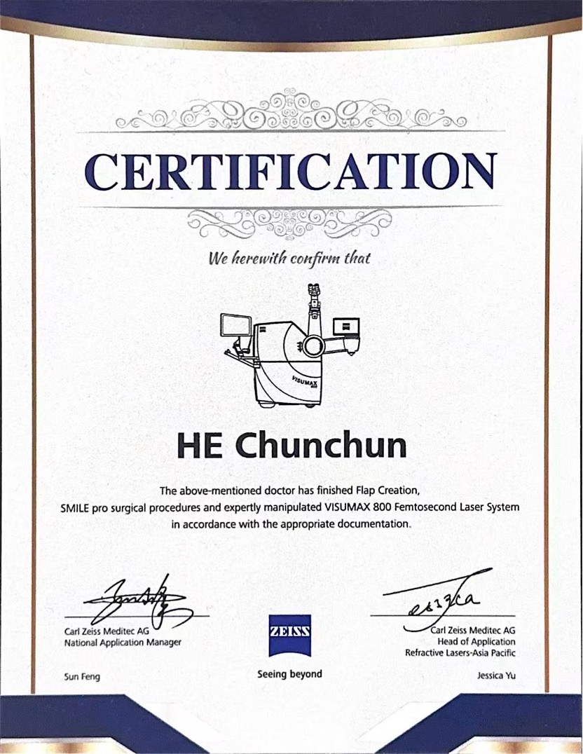 2015年,2017年,2025年,三次于德国汉堡德视佳眼科总部接受SMILE手术及ICL手术培训,传承德国屈光手术的标准和流程